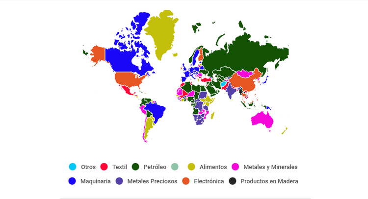 Los colores violeta y fucsia, que predominan en Asia y África, indican las exportaciones de productos como el oro, mineral de hierro y carbón.